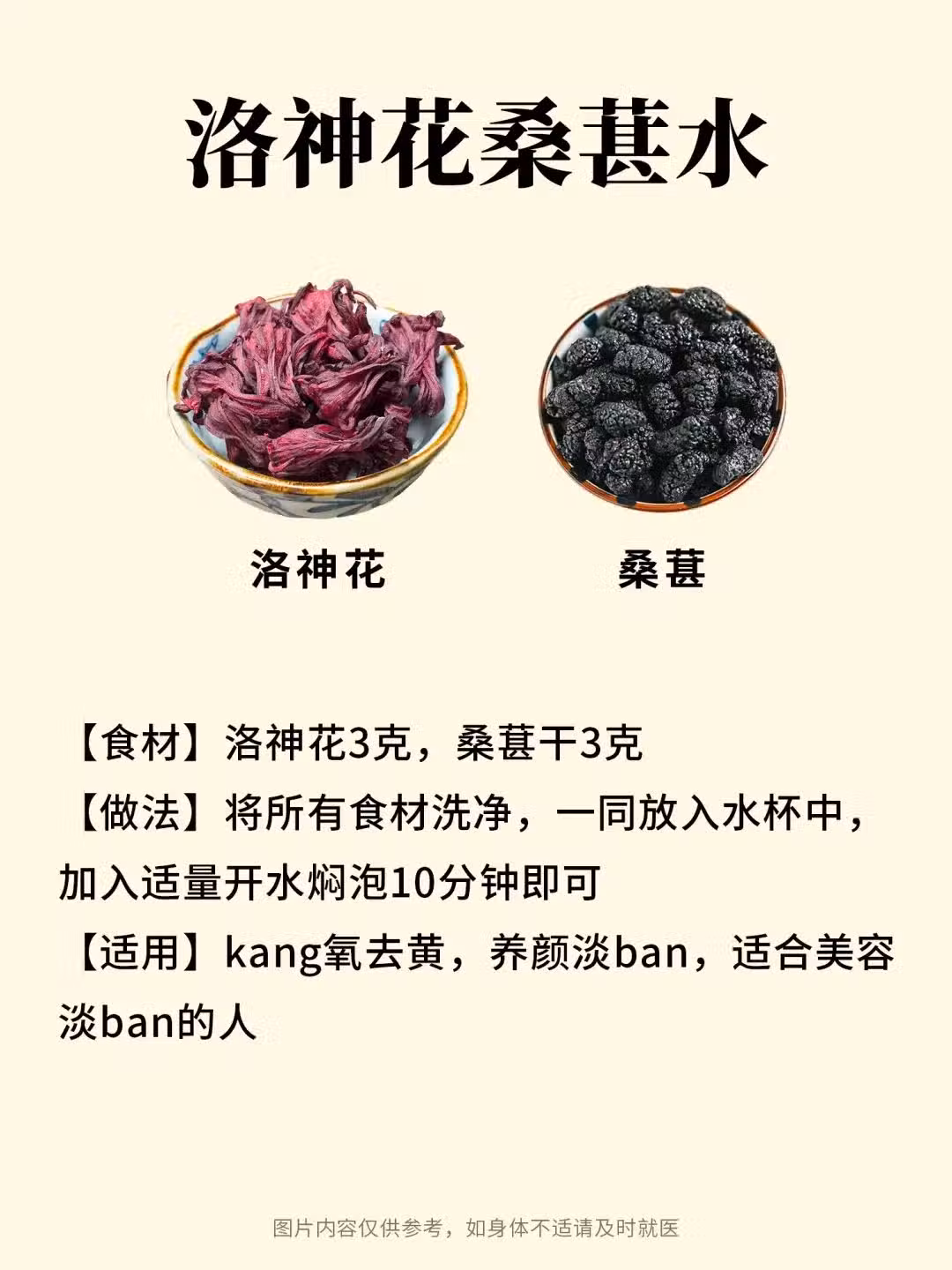 洛神紅棗枸杞水:功效:暖宮元氣飲 配方:洛神花2朵+紅棗3顆+枸杞15粒 注意:經期後連喝5天,紅棗的環磷酸腺苷能提升血色感,手腳冰涼的姑娘秋冬可加兩片薑絲