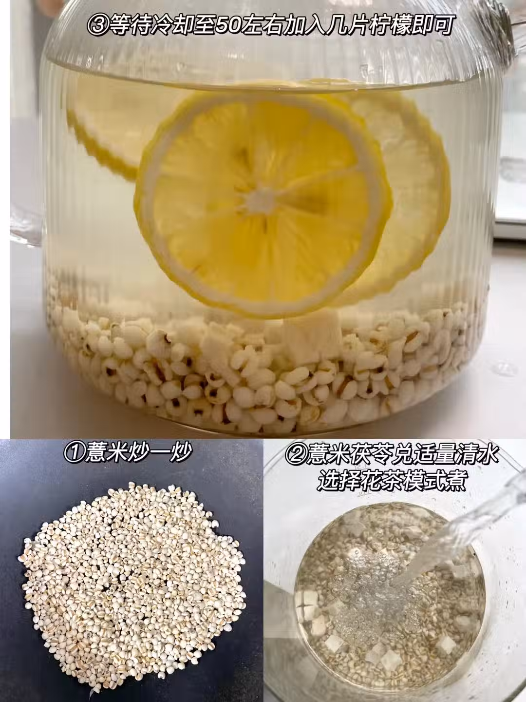 沖泡小貼士 🍵 薏米茯苓洗凈後冷水煮沸,轉小火燜煮20分鐘,待水溫降至60℃後放入檸檬片,保留更多VC。可加少量蜂蜜調味,冷藏後口感更沁涼