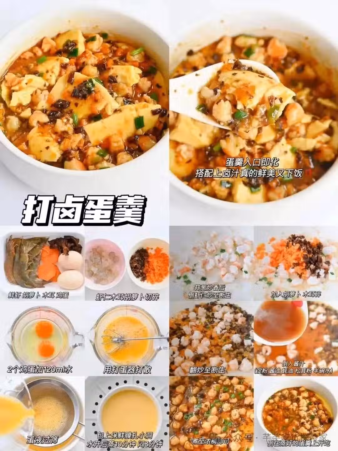 準備食材:雞蛋,胡蘿蔔,鮮蝦,木耳,澱粉,生抽,醬油,蚝油,松茸粉,蔥花。