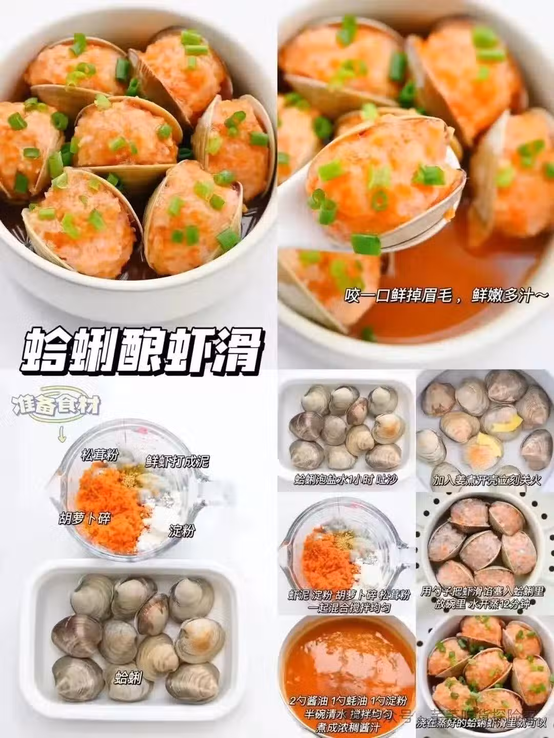 準備食材:蛤蜊,鮮蝦,胡蘿蔔,松茸粉,澱粉,醬油,蚝油,蔥花,姜,鹽。
