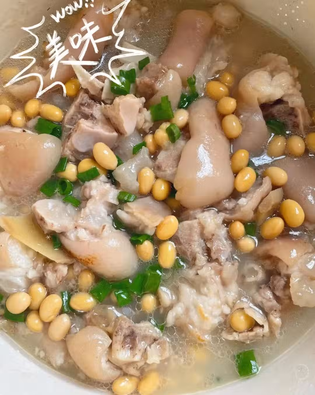 黃豆中的大豆異黃酮可調節激素水平,緩解情緒與失眠;豬蹄的胺基酸和礦物質還能促進血液循環,活血暖宮。常吃這道菜,有助於絕經後女性改善身體不適,延緩衰老。