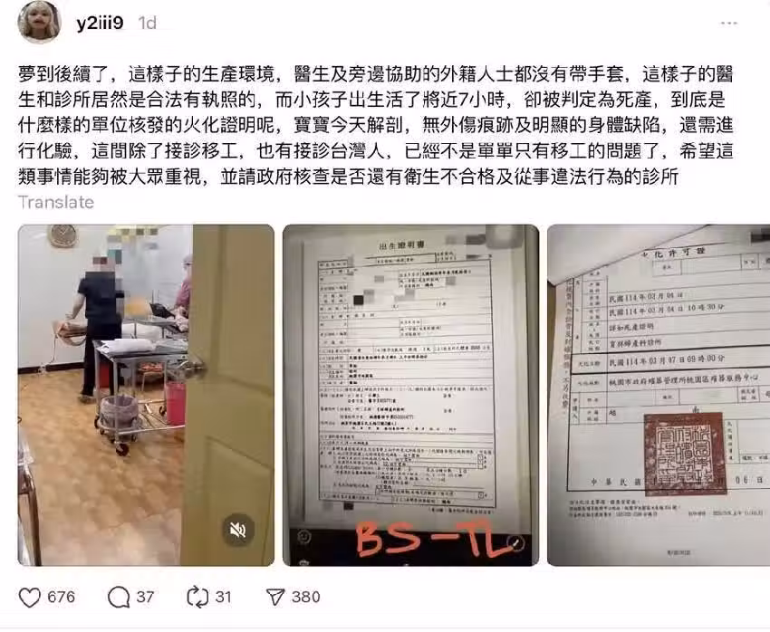 此外,據她所悉,該婦科診所的環境奇差無比,且醫療團隊在接生時竟都沒戴手套,「這樣的醫生和診所居然合法有執照?」,而除了移工,連台灣人也有在此接生,讓她非常擔心有其他受害者出現,呼籲政府重視此案,同時稽查是否仍有通過衛生部檢驗、但仍在從事非法接生的婦科診所。