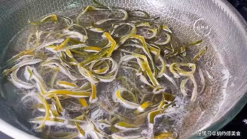 第二步:將海帶切成筷子細的條狀,然後鍋中放入適量的水,大火將水煮開後,接著將海帶放入到鍋中,焯水2分鐘就可以撈出。
