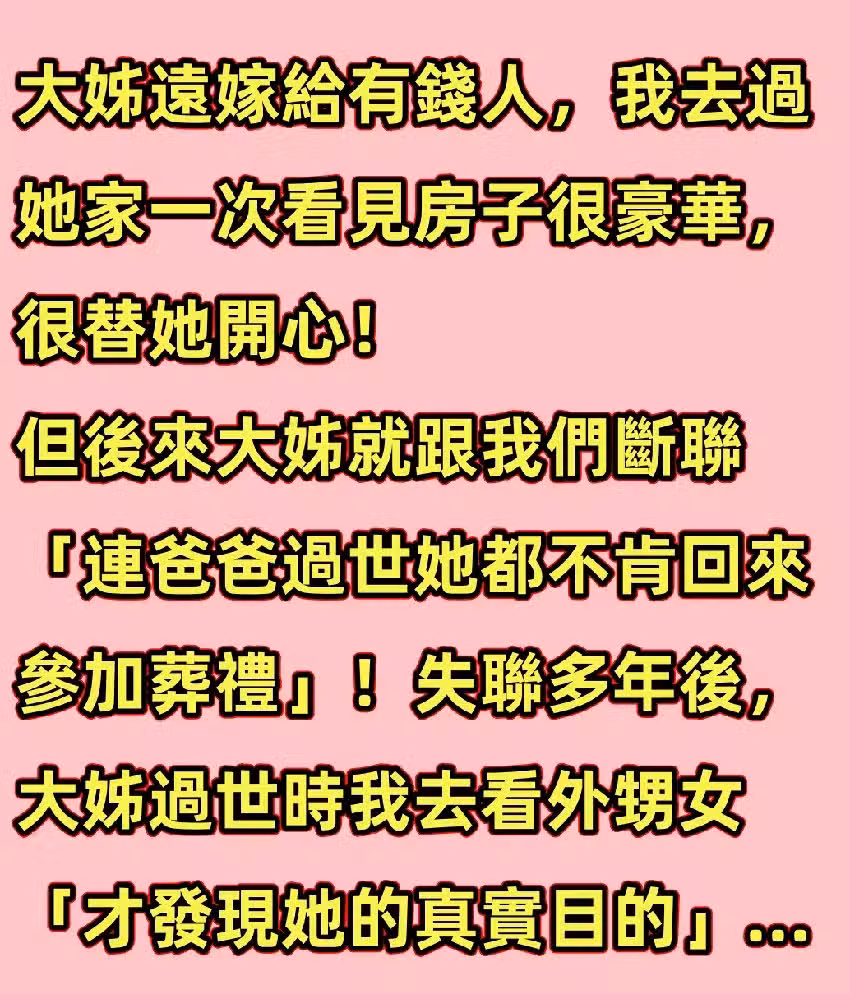 大姐遠嫁給有錢人,我去過她家一次看見房子很豪華,很替她開心! 但後來大姐就跟我們斷聯「連爸爸過世她都不肯回來參加葬禮...」!失聯多年後,大姐過世時我去看外甥女「才發現她的真實目的」…