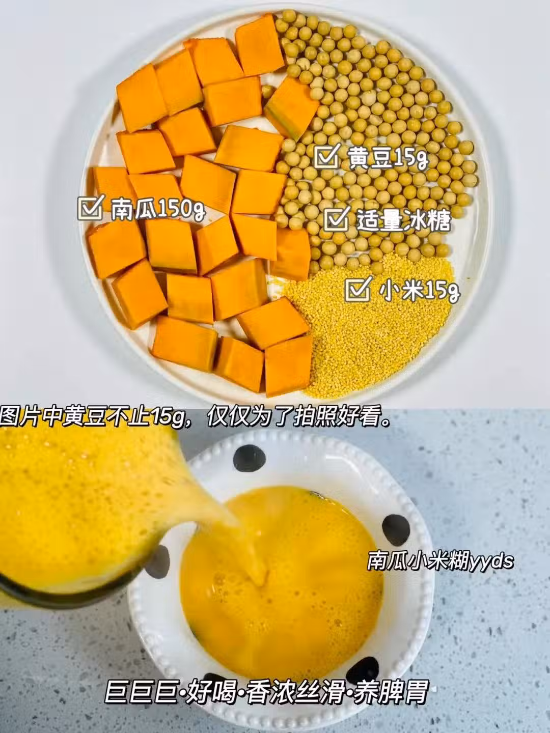 ☑️食材:南瓜150g、黃豆15g、小米15g、適量冰糖