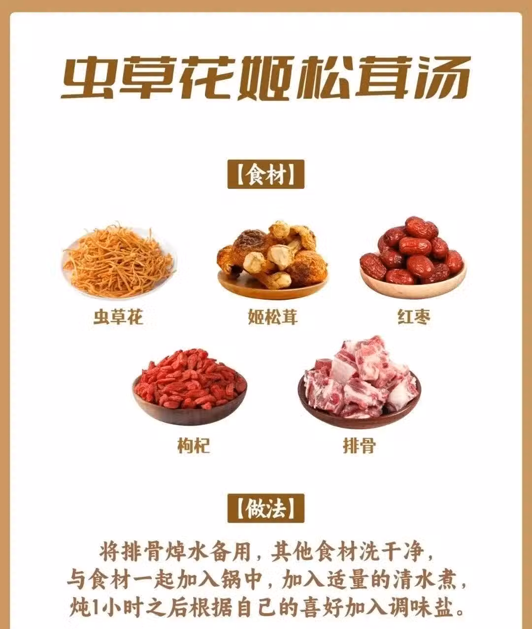 食材:蟲草花、姬松茸、紅棗、枸杞、排骨、排骨