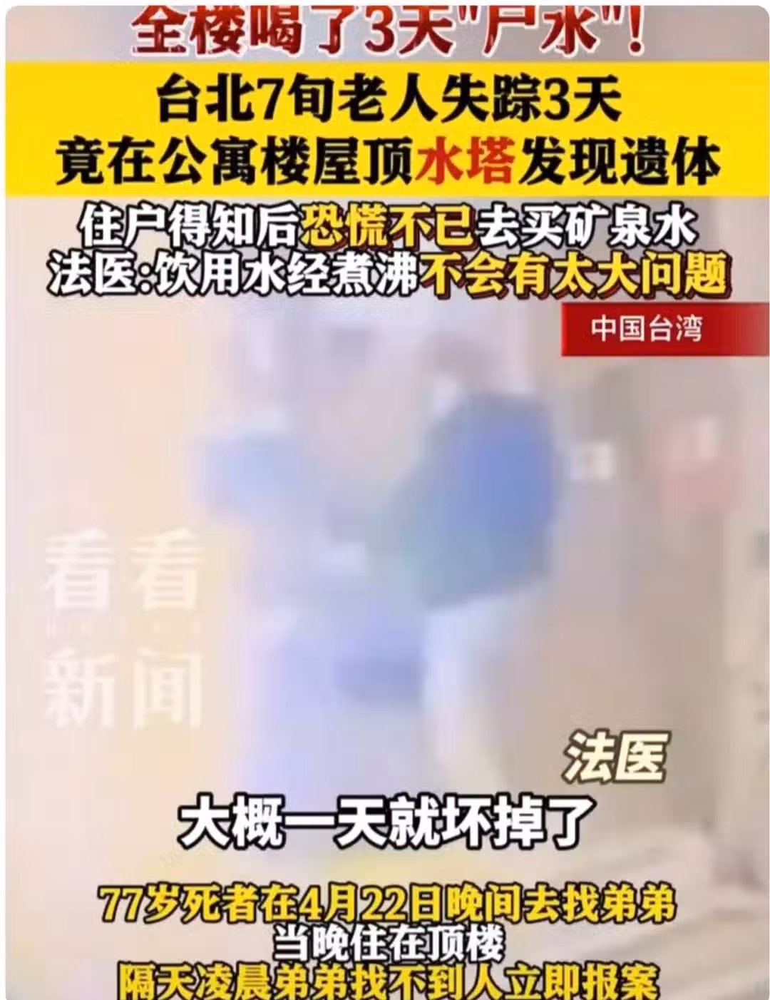 太驚悚!七旬老人泡在樓頂水塔,全樓喝3天「屍水」,法醫:煮沸喝問題不大