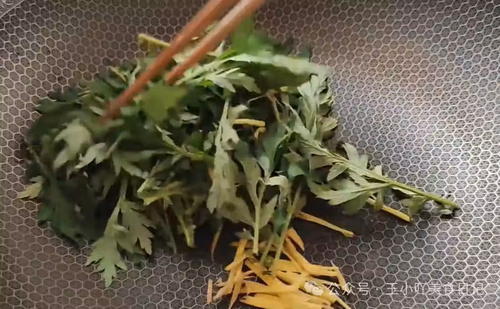 在炒鍋中倒入準備好的艾草莖部和生薑絲,開小火慢慢翻炒。在翻炒的過程中,要不停地翻拌,讓艾草和生薑絲受熱均勻。隨著時間的推移,艾草和生薑絲中的水分會逐漸被揮發出來,它們也會慢慢變干。