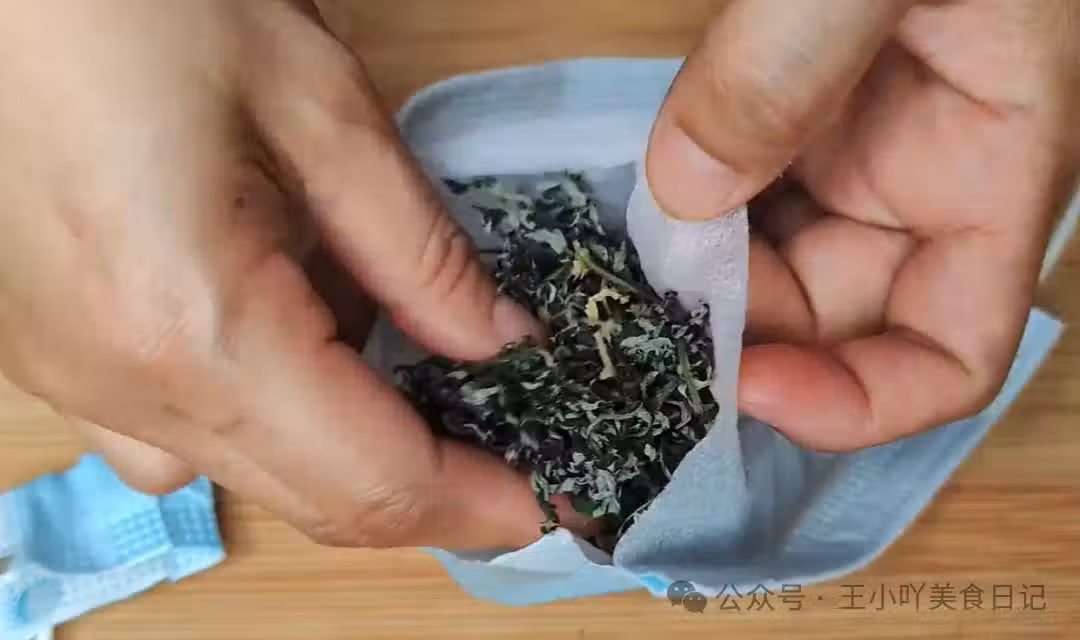 把鍋里炒好的艾草、薑絲、花椒裝進這個簡易的收納袋中。看到這裡,相信大家都已經明白了這個巧妙設計的妙處,不得不佩服老輩人的智慧。最後,把開口處收攏,用之前剪下來的棉繩把它纏繞紮緊,一個艾草生薑花椒包就大功告成了。