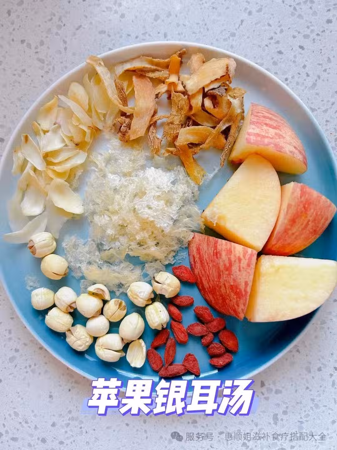 🍎蘋果半個切小丁+銀耳10g+蓮子5-6顆+百合10g+玉竹10g,煮水。潤肺生津、潤腸通便,適合小孩子和乾燥季節。👨👩👧👦