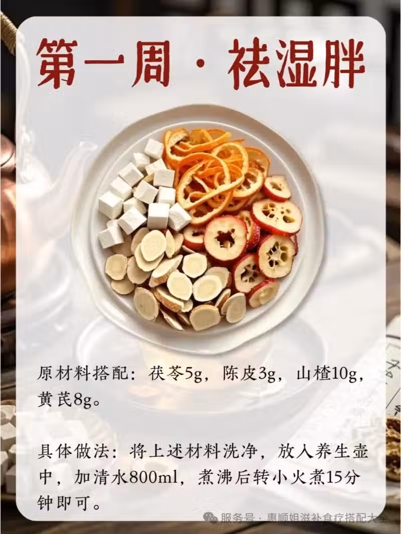 這些藥材相輔相成,茯苓利濕,陳皮理氣,山楂消食,黃芪補氣,共同作用於體內濕氣,讓你輕盈如初。