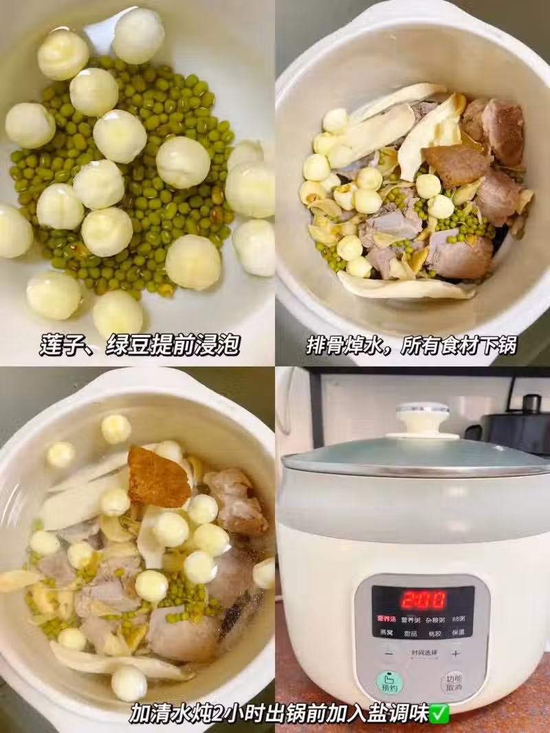 1、將蓮子、綠豆提前用清水浸泡2 - 3小時;排骨洗凈切塊,冷水下鍋焯水,撇去浮沫後撈出;陳皮泡軟、百合洗凈,懷山沖洗乾淨。