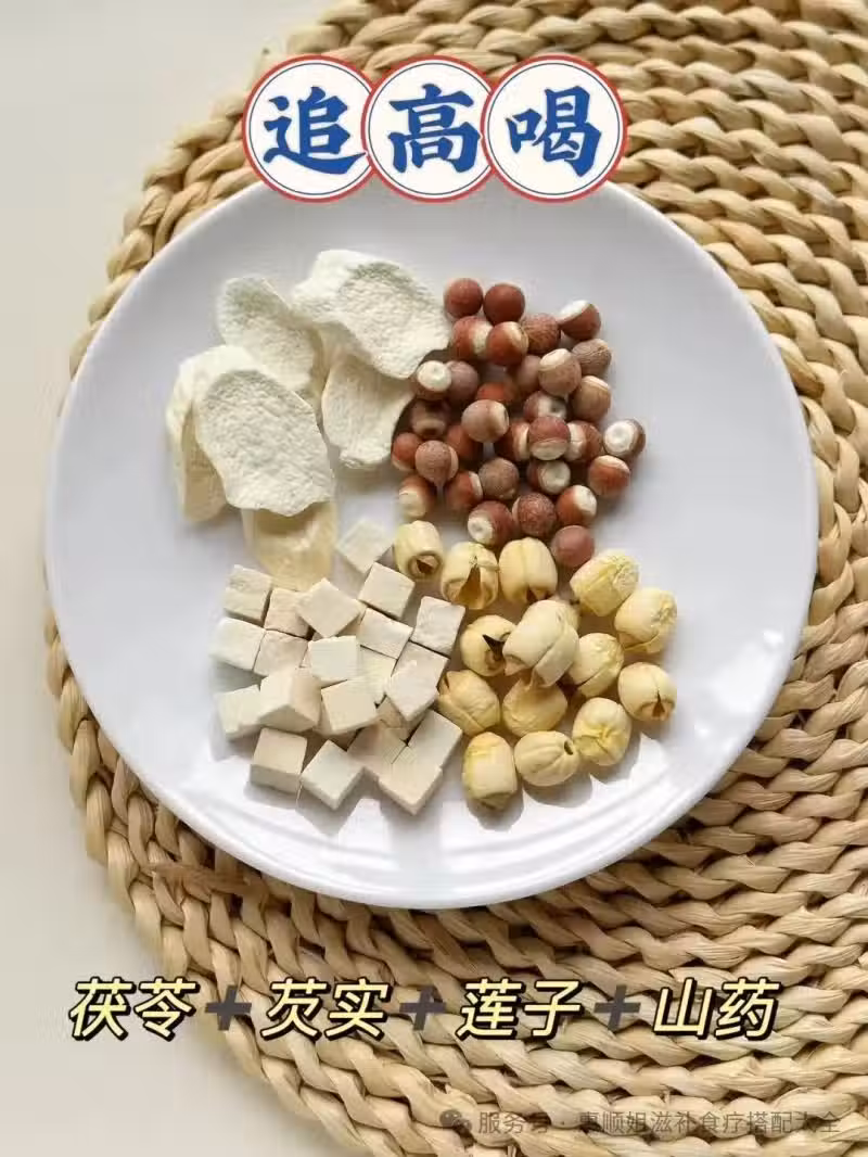 淮山10克+茯苓5克+芡實5克+蓮子10克