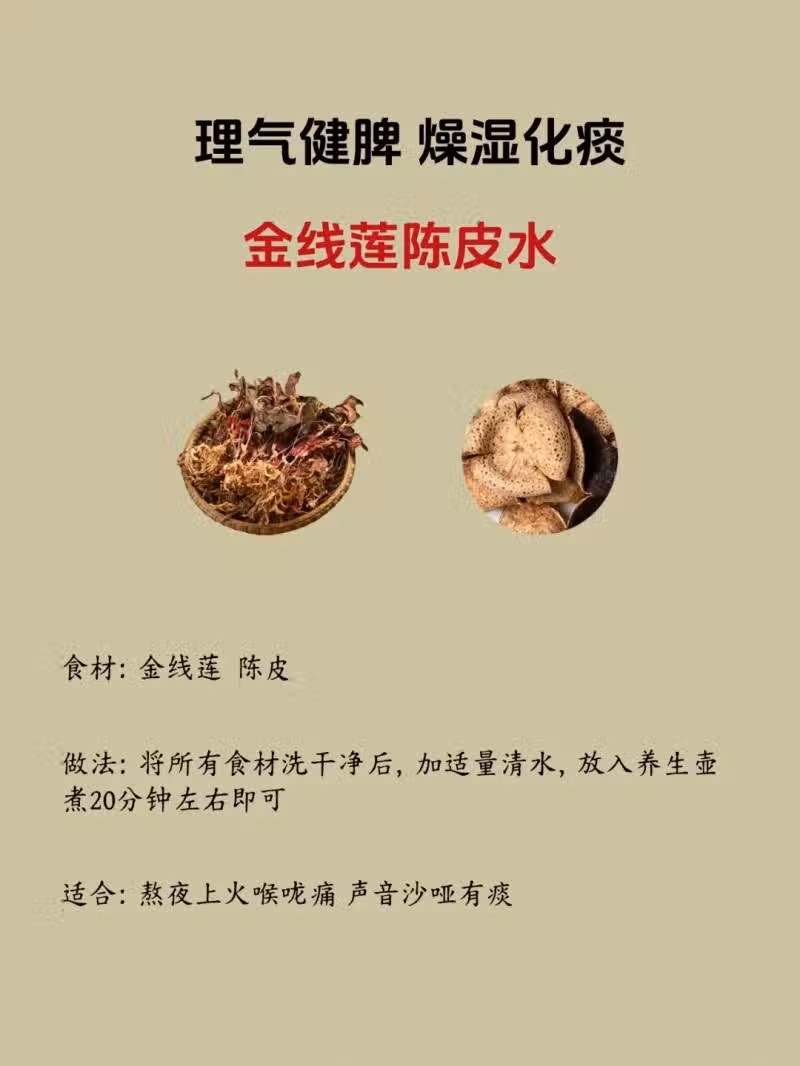 陳皮理氣化痰,與金線蓮煮水,能有效緩解喉嚨有痰、咳嗽等症狀,口感清香,老少皆宜。