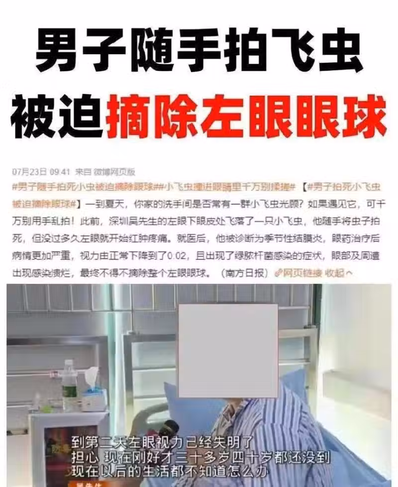 沒多久眼睛就又紅又腫,看醫生後被診斷為季節性結膜炎,後面病情加重,最後眼部周圍感染潰爛,不得不摘除了整個眼球。