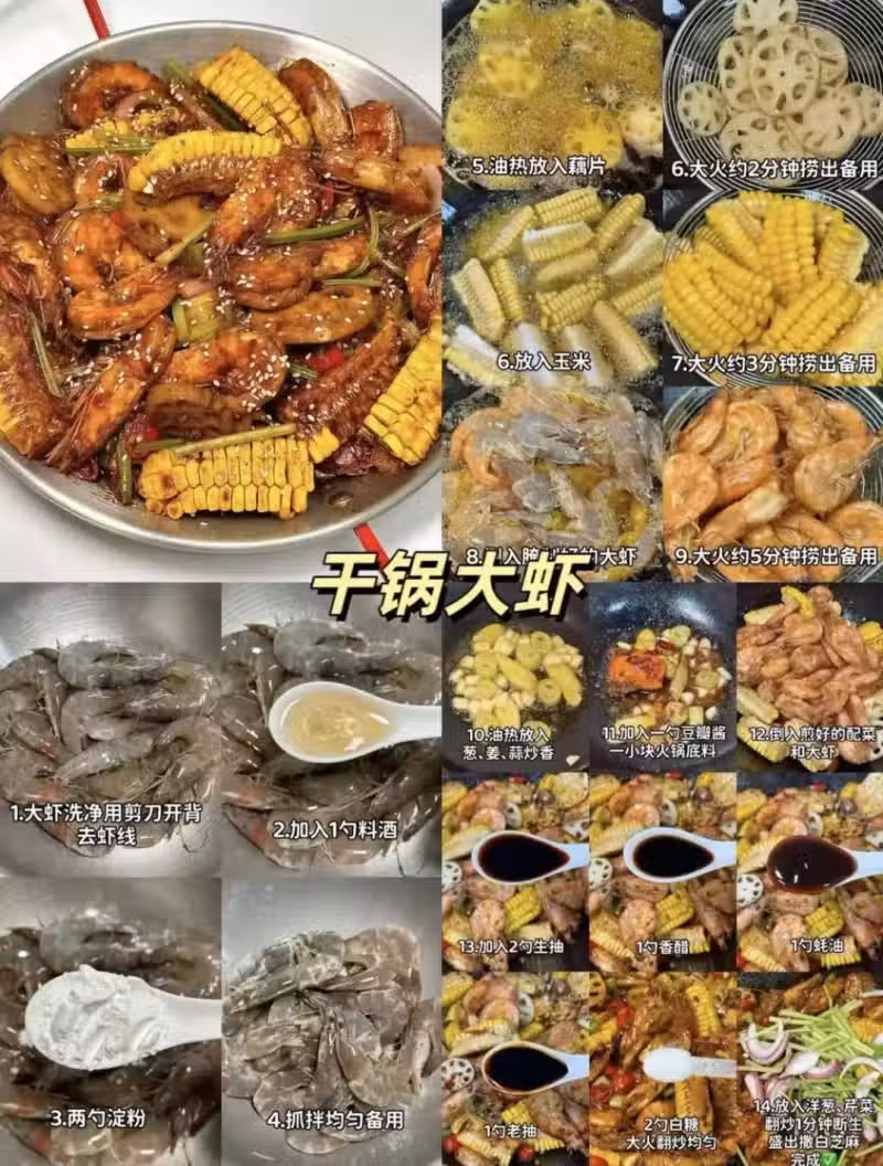 1️⃣0️⃣干鍋大蝦 大蝦在干鍋中熱烈歡騰。外皮被煎至酥脆,辣椒、花椒等香料與之共舞,賦予其熱辣靈魂。入口,蝦殼的脆香、蝦肉的彈嫩與香料的濃烈交織一處,熱辣鮮香瞬間點燃味蕾,於唇齒間奏響一曲熱辣而又富有層次的美食華章。