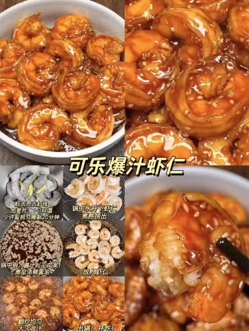 5️⃣可樂爆汁蝦仁 創意與美味共舞。鮮嫩蝦仁在可樂的甜蜜擁抱中翻滾,烹飪中巧妙融合可樂的焦糖香與蝦肉的鮮美。入口瞬間,蝦仁於齒間爆發出鮮甜汁液,可樂的獨特風味縈繞舌尖,甜潤與鮮嫩交織,開啟一場新奇美妙的味覺冒險之旅。 調醬汁:一勺蚝油十一勺生抽十一勺蜂蜜十150ml可樂十一勺芝麻十兩勺番茄醬攪拌均勻即