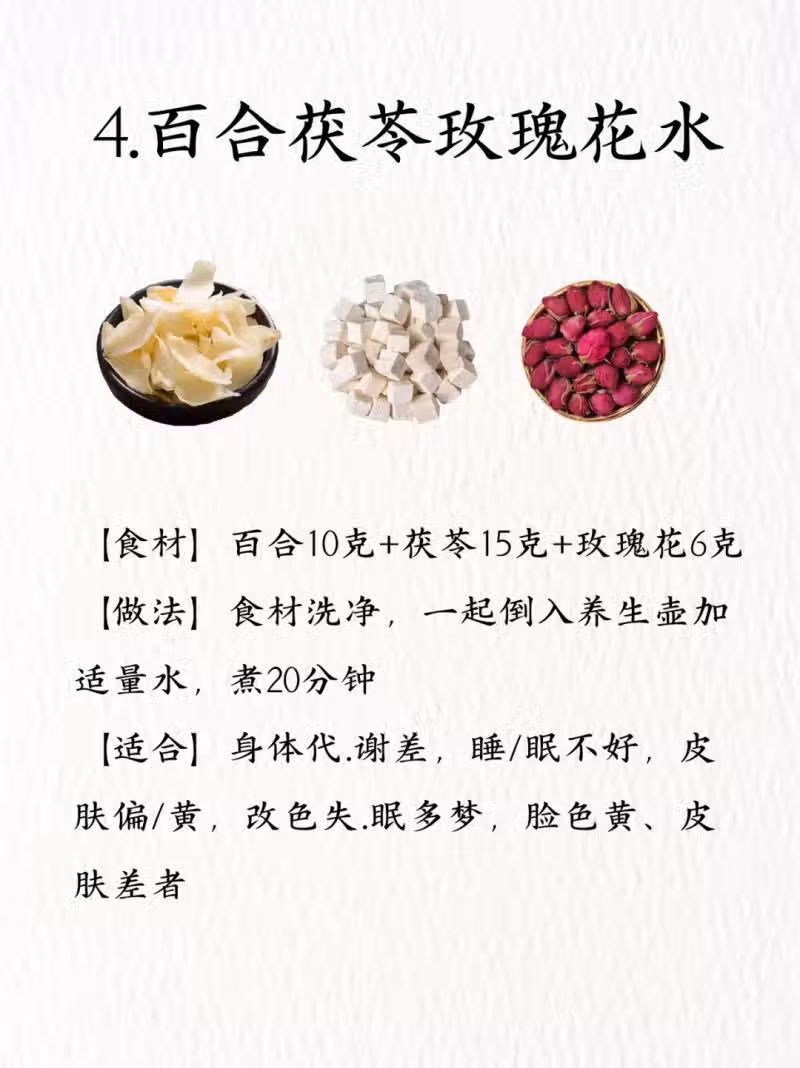 4. 百合茯苓玫瑰花水:有助於提升身體代謝,適合代謝差、睡眠不好、皮膚偏黃、失眠多夢的人。