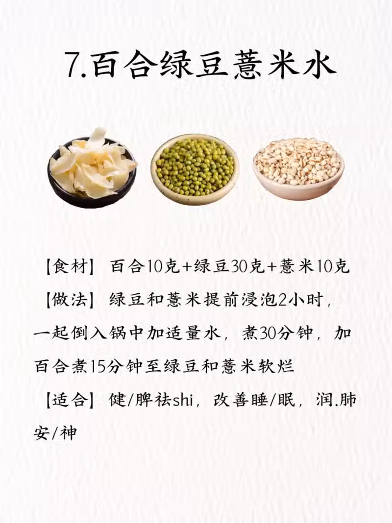 7. 百合綠豆薏米水:可健脾祛濕、改善睡眠、潤肺安神。