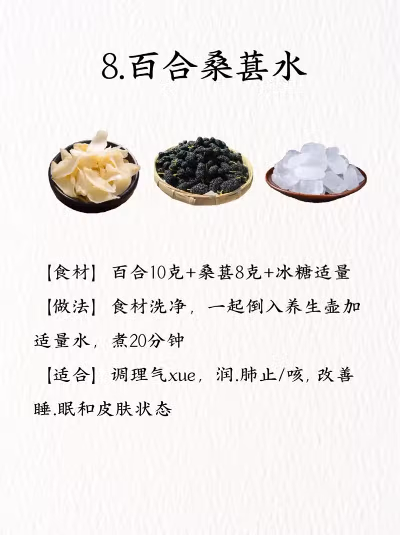 8. 百合桑葚水:能調理氣血、潤肺止咳,改善睡眠和皮膚狀態。