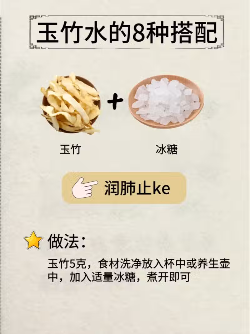 7. 玉竹+冰糖:潤肺止咳的經典組合,嗓子干癢、咳嗽時,來上一杯,立馬舒服 。