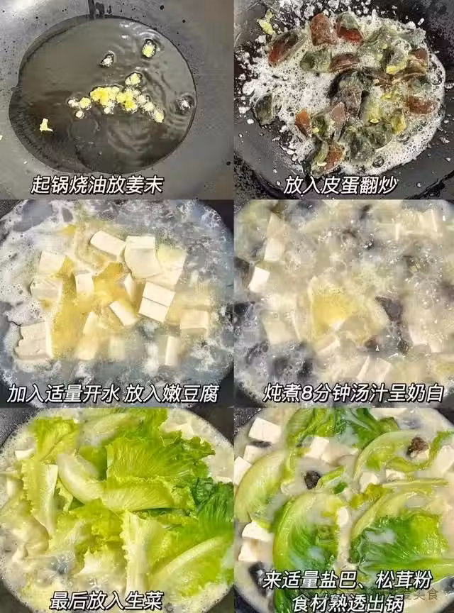 3.皮蛋獨特的香氣融在湯里,豆腐嫩得入口即化,生菜葉子吸飽湯汁,連喝兩碗都不膩。