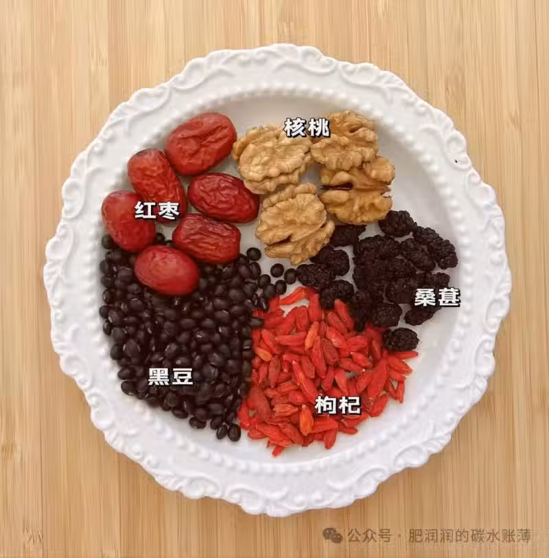 黑豆1小把 、桑葚干15顆、 核桃4個、紅棗6顆、 枸杞1搓