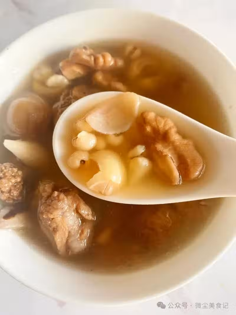 食材:排骨400克、核桃5-6個、芡實15克、百合15克、薏米20克、桂圓5-7個、蓮子10克、黨參10克、無花果5-6個、紅棗3-5個