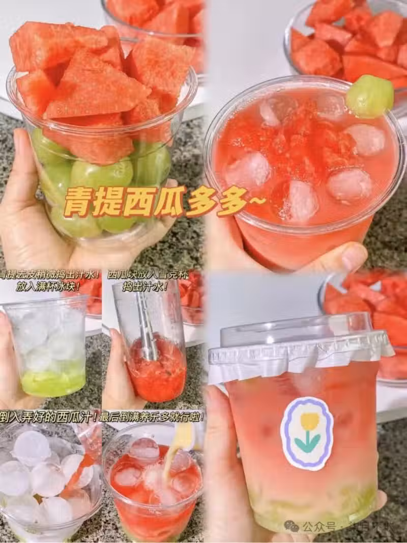 5️⃣寶子們💖,夏日必喝的青提西瓜多多來啦! 把青提和西瓜分別搗出汁水,那清新果香瞬間瀰漫。加入滿杯冰塊,再倒入西瓜汁,最後用養樂多封頂。一口下去,酸甜冰爽,仿佛把整個夏天的清爽都喝進肚裡啦,快動手做起來!