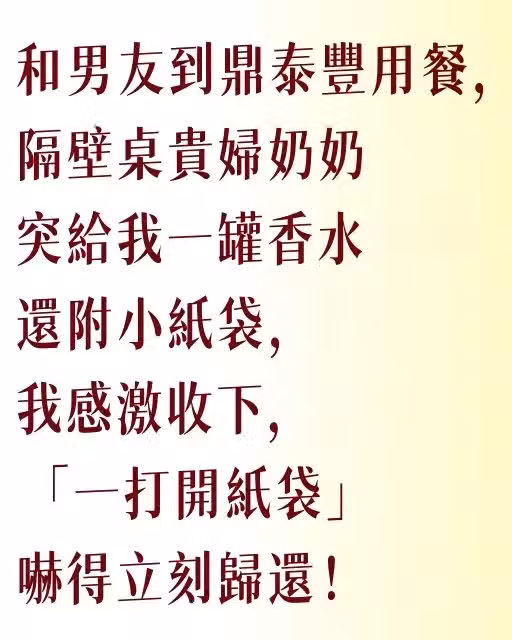 和男友到鼎泰豐用餐,隔壁桌貴婦奶奶突給我一罐香水還附小紙袋,我感激收下,「一打開紙袋」嚇得立刻歸還...