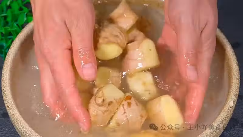 揉洗:用手輕輕抓拌姜塊,持續2-3分鐘,使鹽分充分接觸姜肉。隨後靜置10分鐘,倒掉鹽水,再用涼開水沖洗2遍。