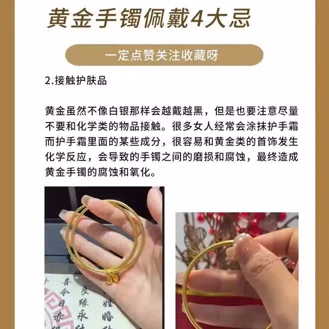 黃金屬於比較穩定的金屬,一般不會被腐蝕氧化。但是我們也要儘量避開接觸護膚品和化妝品,因為化妝品或者護膚品的很多成分,容易與黃金手鐲產生化學反應,造成腐蝕氧化。
