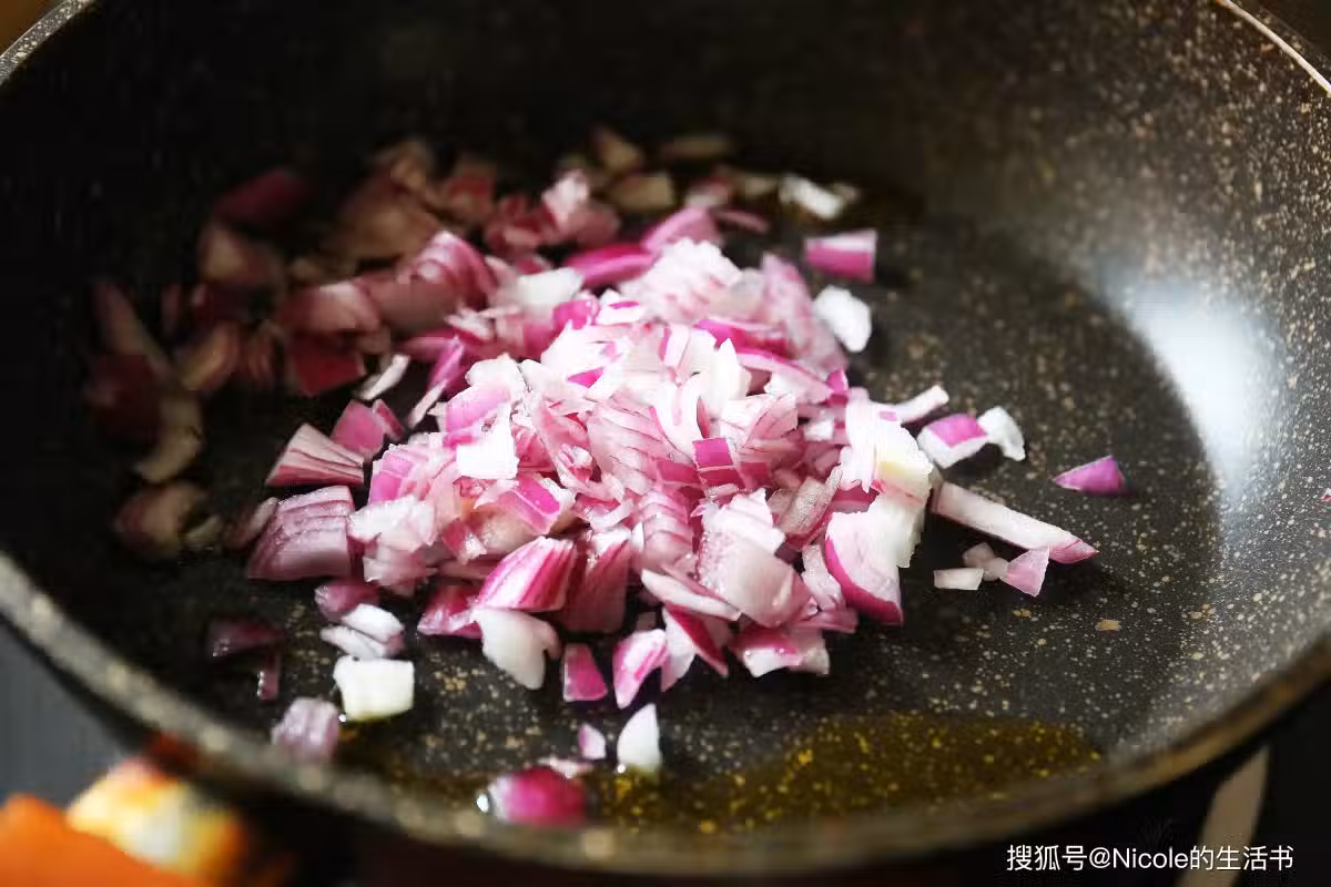 5、再放入番茄丁,繼續翻炒1分鐘;