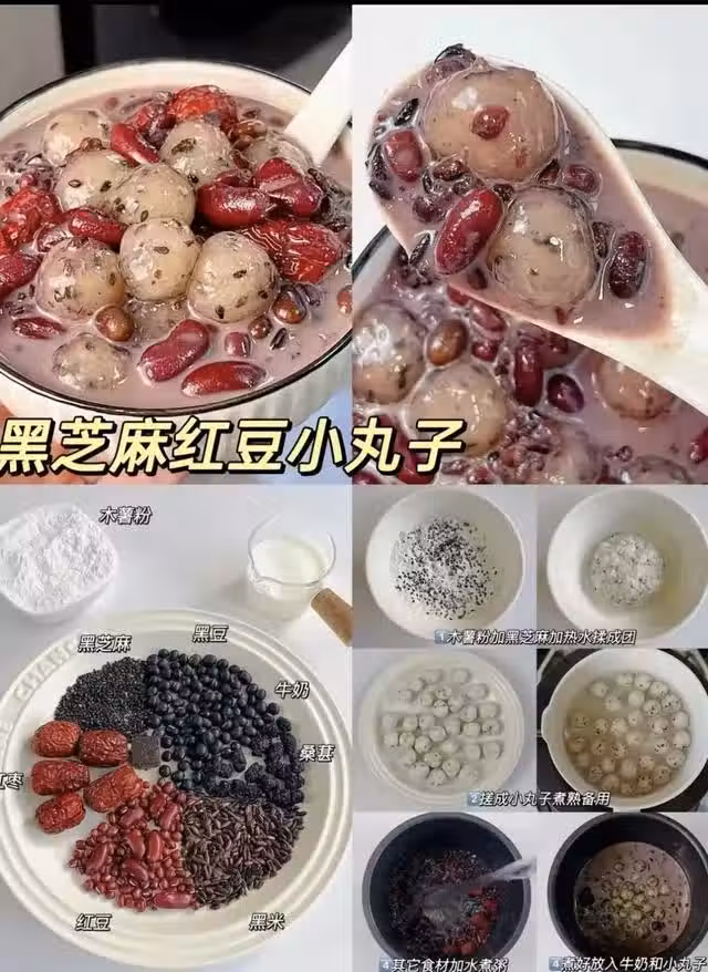 做法:木薯粉加黑芝麻加熱水揉成團,搓成小丸子煮熟備用;其他食材加水煮粥,煮好放入牛奶和小丸子。