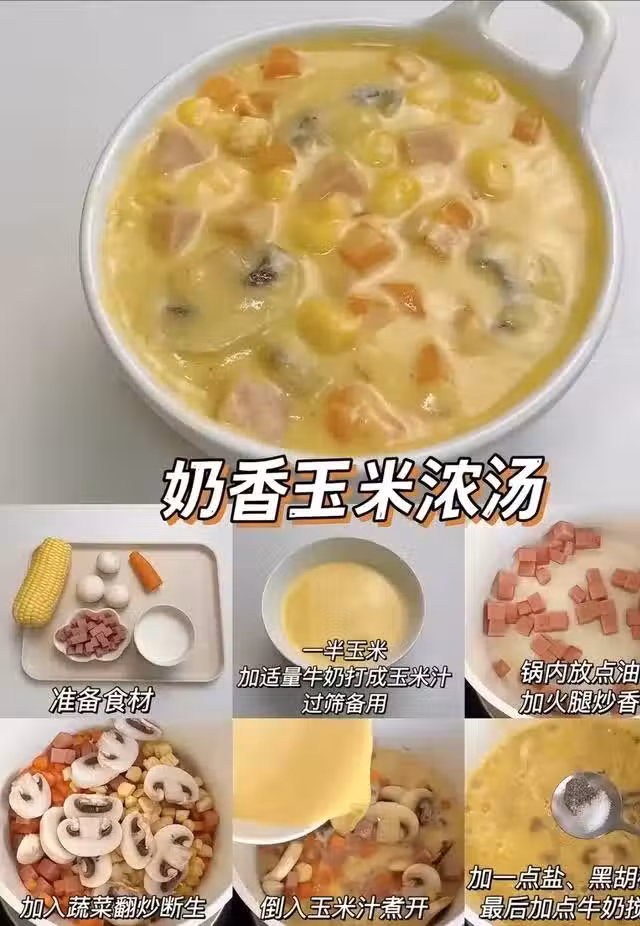 奶香玉米濃湯:飽腹感超強,喝完一下午都不餓!玉米汁里加幾顆腰果,香濃加倍,瞬間治癒疲憊的靈魂 。