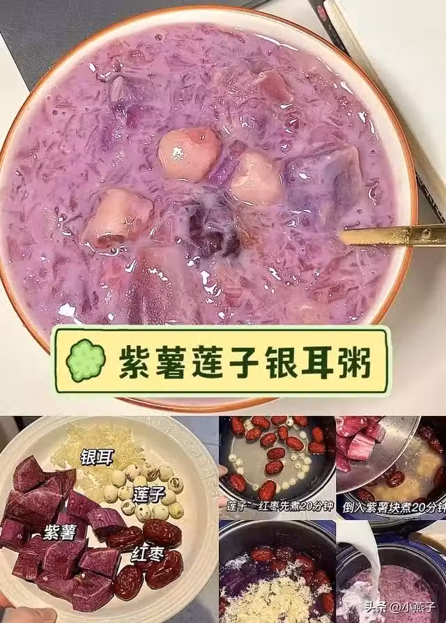 做法:蓮子紅棗先煮20分鐘→加紫薯塊煮20分鐘→最後放銀耳煮出膠。