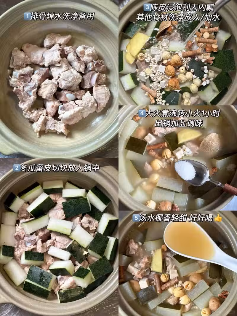 做法: 排骨焯水洗凈備用; 陳皮提前浸泡颳去內瓤; 冬瓜留皮切塊,所有食材洗凈放入鍋中; 加水,大火煮沸轉小火1小時,出鍋前加鹽調味即可。 這道湯品結合了多種中藥材和食材,具有豐富的營養價值和多種功效,