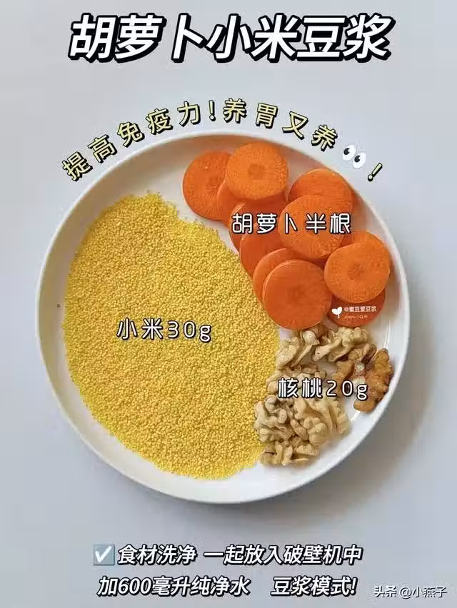 食材:胡蘿蔔半根+小米30g+核桃20g。