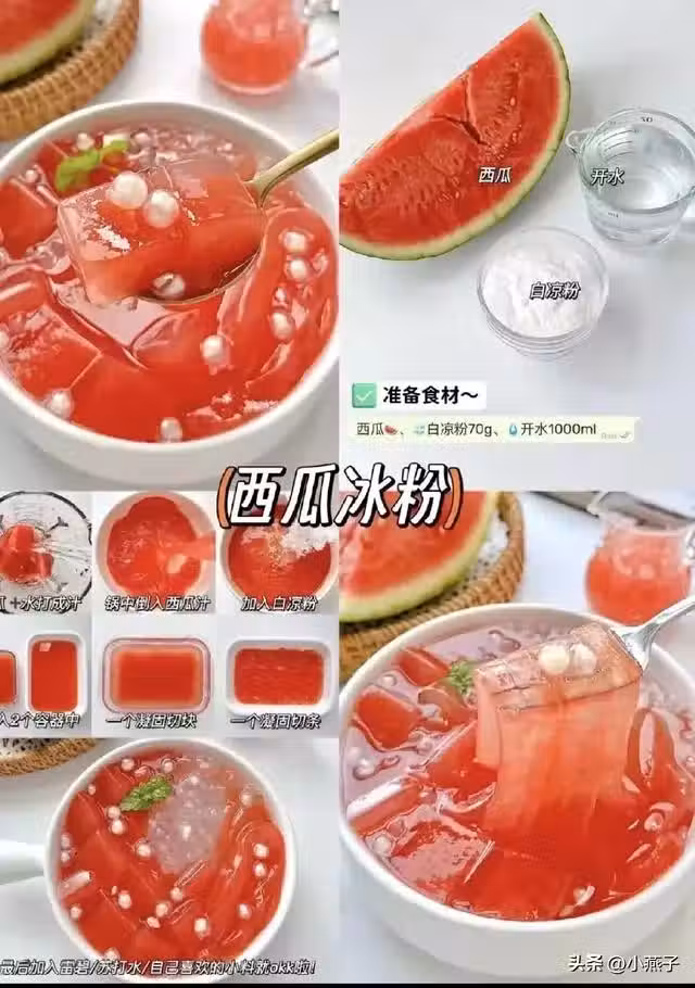 ❶ 70g白涼粉+1000ml開水,西瓜切塊打成汁(可留點果肉)。