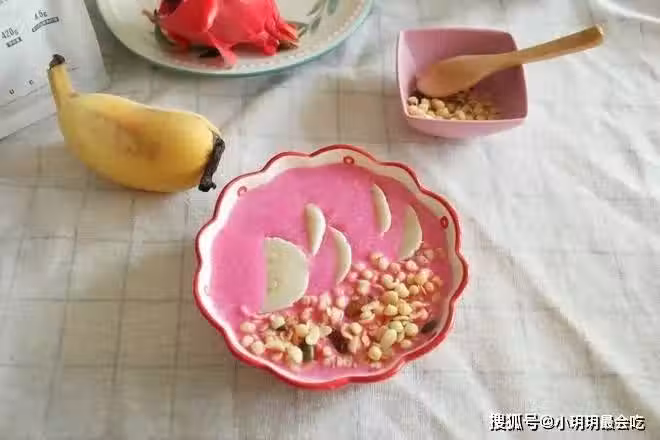 火龍果半隻、蘋果香蕉一個、牛奶175毫升、麥片脆一把
