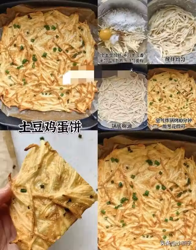 1. 土豆切絲泡水去澱粉,擠干後加蛋液、麵粉、調料。