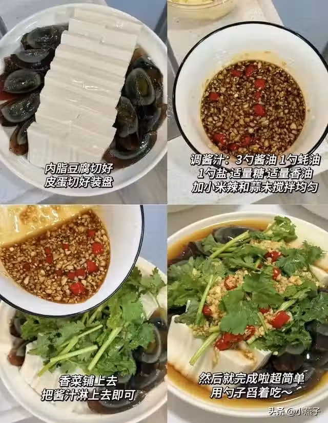 食材:內脂豆腐1盒、皮蛋2個、小米辣、蒜末。