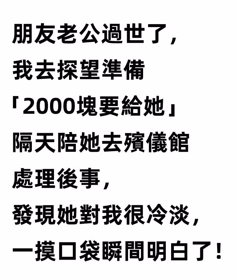朋友老公過世了,我去探望「準備2000塊要給她」,隔天陪她去殯儀館處理後事,發現她對我很冷淡,一摸口袋瞬間明白了!