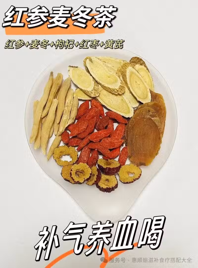 紅參2片+黃芪3克+枸杞1把+麥冬3克+紅棗3顆