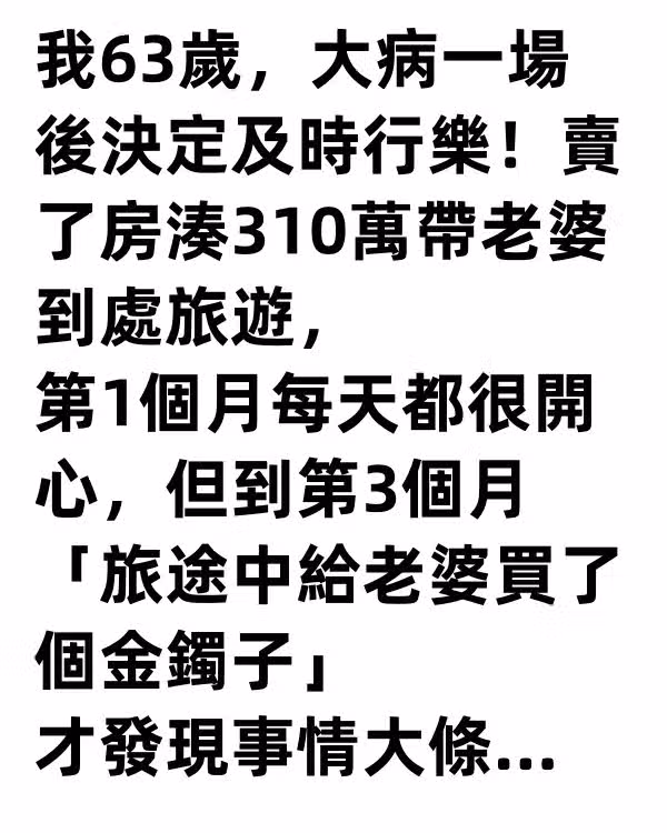 我63歲,大病一場後決定及時行樂!賣了房湊310萬帶老婆到處旅遊,第1個月每天都很開心,但到第3個月「旅途中給老婆買了個金鐲子...」才發現事情大條...