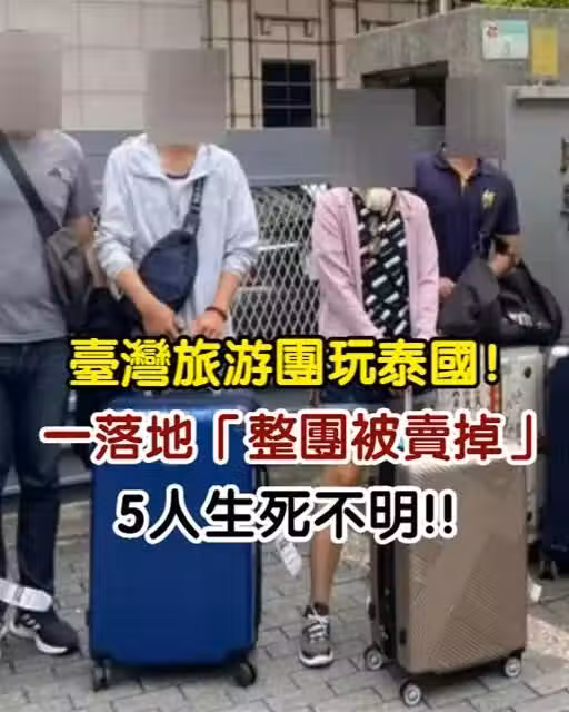 台灣一旅遊團出發前往泰國遊玩,結果一下機「整團被賣掉」,8人全變成「豬仔」慘遭囚禁,其中3名婦女各交40萬不等贖金逃生,爆出還有5名年輕人生死未明。