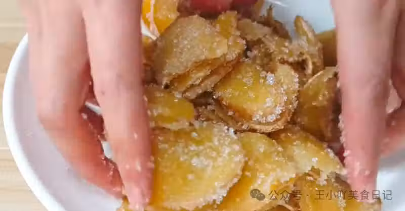 等薑片稍微放涼,撈出來裝盤。一定要等薑片完全冷卻後,再在表面撒上一層白糖,怕辣的朋友可以多撒點。要是薑片還熱乎就撒糖,白糖很快就融化啦!最後,把裹好糖的薑片裝進乾淨無水無油的密封瓶里,想吃的時候隨時拿兩片,炒菜時放進去增香去腥,超方便!