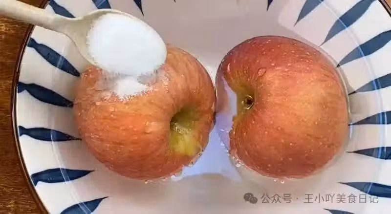 清洗蘋果:準備一個大碗,往碗中多加入一些清水,水量要能夠沒過蘋果。接著,往每個蘋果上面均勻地撒入一些食用鹽。食用鹽在這裡起到了關鍵作用,它具有殺菌消毒的功效,同時用鹽來搓洗蘋果,可以更好地去除蘋果表皮的果蠟。