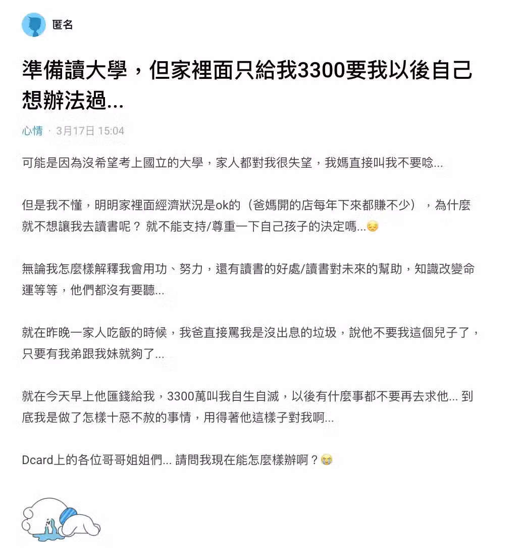 沒上到國立大學!他被父母趕出家門「不要這個兒子了」 他崩潰喊「只給我3300萬」:要我自生自滅