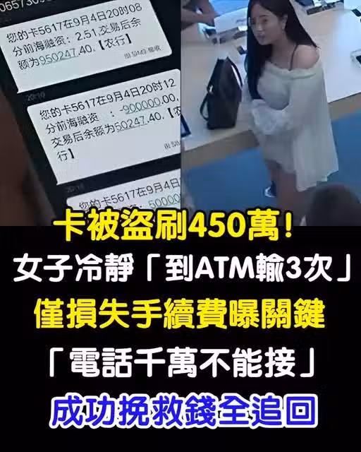 卡被盜刷450萬!女子冷靜「跑ATM輸3次」只損失手續費,她曝關鍵「電話千萬不能接」成功挽救全追回!